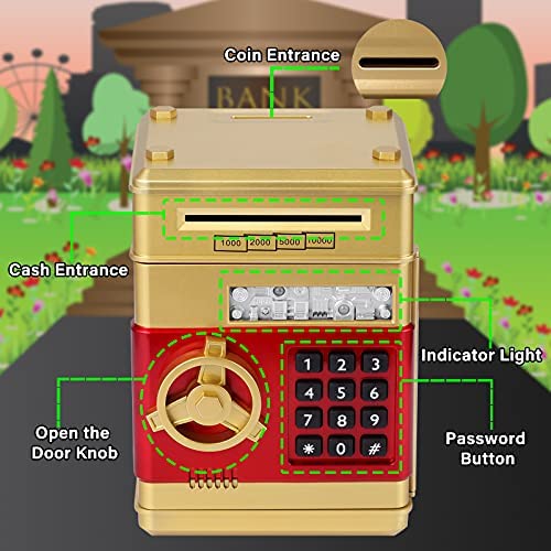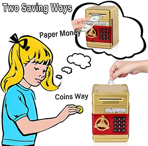 Safety DesignMade of high-quality environmentally ABS plastic,stylish and beautiful design, strong and drop resistant. Adults and children can use it. Applicable battery: 3*AA battery (not included). Password Piggy BankYou can set personal password to improve your childrens awareness of property security. This electronic piggy bank is a great gift for boys and girls aged 4 , 5, 6, 7, 8, 9, 10 years old on any occasion. Large Capacity Money Bank5.1*4.7*7.5 inches, it can store 600 coins or 100 banknotes, also some personal precious items. Greatly help improve childrens financial awareness, and let your child develop the habit of saving money. Simple OperationAim the cash at the cash reel port, it will automatically suck the banknotes like an ATM machine(But it doesnt work if the paper money is too old or too soft) There is a coin slot on the top to put coins to save money.An easy-to-use and fun bank is the first step for children to become financially independent. Great Gift for KidsGreat Christmas & Birthday gifts for children, they will definitely surprise and love it. If you have any questions about the product, please contact us. I wish you the best shopping experience.