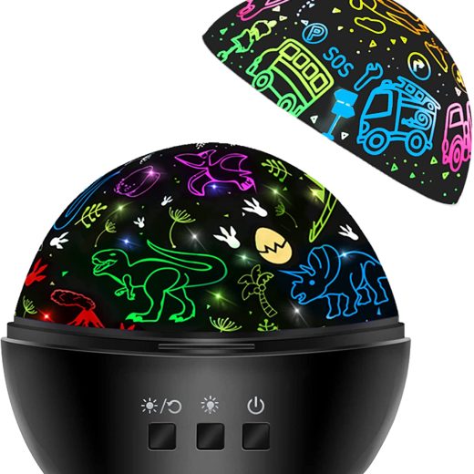 ?Creative LED Projector Visual Effect?The Dinosaur Toys is made with dinosaur theme and car theme to create a gorgeous optical gorgeous illusion with a realistic Triceratops Pterosaur T-Rex and More shape design, which is novelty and charming. Its bound to amaze and impress your kids and guests. It is a unique birthday, Christmas or Easter gifts for kid or friends.Educational Toys for Little Baby,DREAM ROTATING ?Dinosaur Toys PROJECTION LAMP? The LED night light comes with 360 Degree Rotating with 16 color combinations and touch control to adjust 16 different colors as you like.The Dinosaur toys night light can be fixed in Dynamic or gradient color to decorate childrens room, living room, bedroom, office, etc. ?Dual Power Mode?Our Dinosaur Toys LED Night Light&car projector for kids can be powered by 4-AA batteries(not included) or 5V USB cable connected to PC or your home adaptor(not included), which is very easy and convenient. It is a great creative decorative lights for children bedroom, living room,dinning room and outdoor decoration. ?Eco-friendly & Safety?The Dinosaur toy LED lamp&Car projector for kids is made from Safe approved eco-friendly material, safe and harmless to the human body. The night light comes with soft, uniform, non-flicker light, making it safe to your kids, bringing them a nice sleep. It is a very human and practical kids night lights for bedroom. ?Great Gift Idea? – Whether you’re looking for a birthday gift,birthday toy,stocking stuffer Christmas gift or dinosaur themed party supplies or party favors this will be the gift that will make you the favorite parent, aunt, uncle or grandma!They are life-like and great for boys and girls age 3 year old and up.