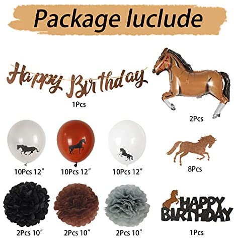 Applicable occasion: These banners are suitable for horse racing party, baby shower, bridal shower, birthday party and so on, to give you a happy moment. Wide usage: These garlands can be applied as decorations on walls, ceilings as well, good for home, classroom, birthday party and so on, decorate your home and give a minimalist feel, create a relaxed feel in the room. Package includes: 24 pcs Brown White horse latex balloons 2 pcs horse foil balloons 1 pcs horse cake topper 1 pcs horse Happy Birthday banner 1 string horse garlands 9 pcs flower paper pom poms 2 pcs 10m white ribbons Note: Manual measurement, please allow slight errors on size. The colors may exist slight difference due to different screens. Winding risk may exist, please keep away from kids under 3 years old. Please keep the balloon away from pointed objects, heat or fire resources. And do not over inflate the balloon to avoid bursting.