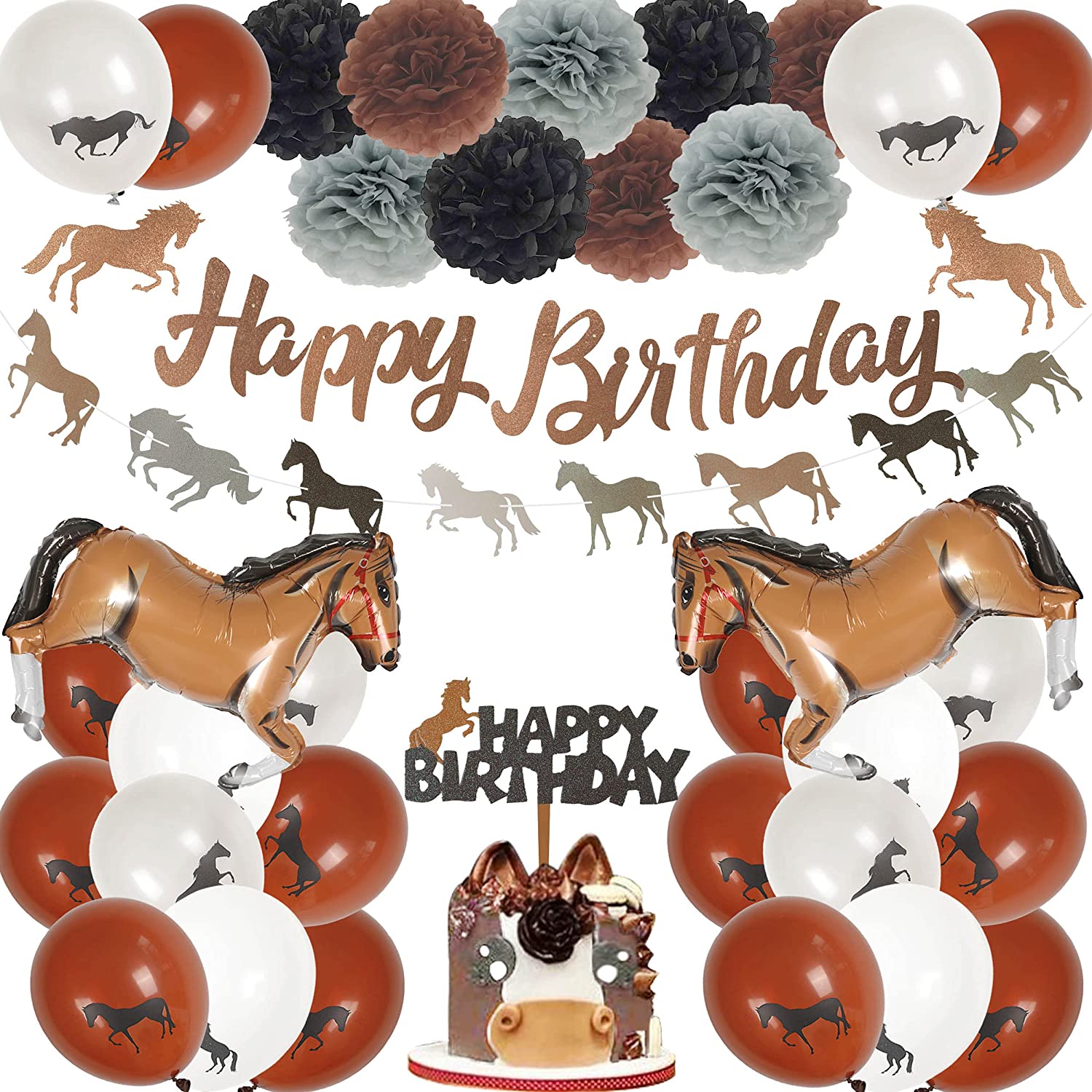 Horse Theme Birthday Party Decorations Kits with Felt Horse Garland Banner, Horse Racing Happy Birthday Banner,Brown White Latex Horse Balloons for Kid Western Cowboy Pony Birthday Party Decoration