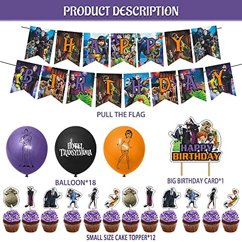 Where to Decorate: You can hang these Hotel Transylvania party supplies on wall, ceiling, porch, door, yard, fence and other places you want to look different, classic interesting elements and bright colors make them full of fun, convenient to hang up, playing with your imagination and creation to make decorative combinations. Create unforgettable memories: These Hotel Transylvania cartoon anime themed birthday themed banner, cake topper, cupcake toppers, latex balloons can be applied to decorate indoor and outdoor. Besides, they can also be served as fun and vibrant photo props, which will help you take many interesting photos, leaving you an unforgettable memory with your friends and families. Package includes: 1 x Happy birthday banners 18 x Latex balloons 1 x Big cake topper 12 x Cupcake toppers50 x Hotel Transylvania Stickers