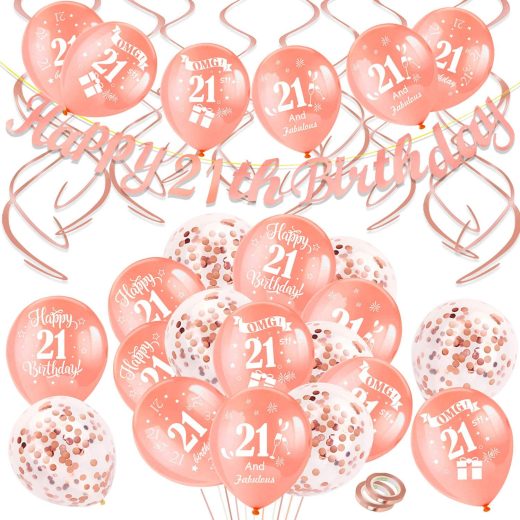 HOWAF 46 Pieces 21st Birthday Decoration Kit, Include Happy 21st Birthday Banner, Hanging Swirls and 21st Birthday Balloons for Women 21st Birthday Party Decoration Supplies, Rose Gold (Age 21)