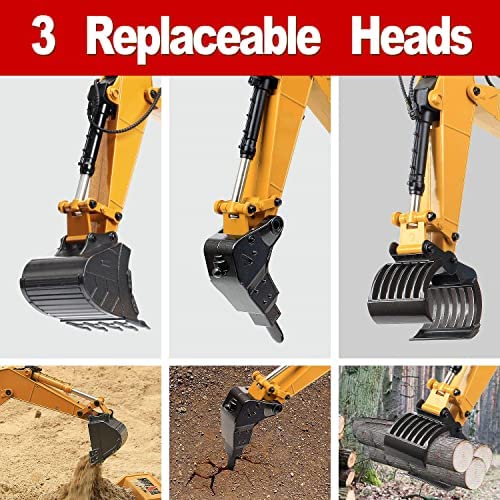ACCESSORIES: Tongli1580 RC excavator comes with bucket, breaker, grab, transmitter, rechargeable battery, USB charging cable and instructions. The bucket, breaker and grab are all alloy metal material, strong and durable. The heads can be changed at will, easy to install.