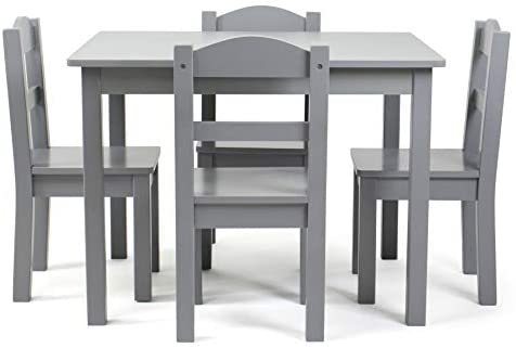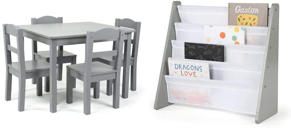 Humble Crew Kids Wood Table and 4 Chair Set, Grey & Grey/White Kids Book Rack Storage Bookshelf, 4 Tiers