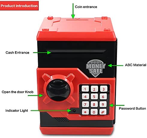Product Specifications: Packing Size: 14.3x15x20.3cm (5.63×5.9×7.99 inch); Packing Weight: 640g (1.41lb); Capacity: Store 600 pieces of coins or 100 pieces of paper money; Batteries: 3 pieces of AA batteries (not included). Safety Material: Made of 100% safe ABS plastic and electronic components. The body is made of environmentally friendly anti-fall material, which is strong and anti-fall, greatly extending the service life. The Best Gift for kids, children, boys and girls. The Function of The Piggy Bank: It is protected with a 4-digit password. The initial password is 0000. You can change it to any 4-digit password. Keep your little secret to yourself, lock them in this safe. Two Saving Way: You can store coins and bills at the same time. The coin entrance is directly above. The bills entrance located directly in front will automatically roll the bills into the safe. What You Get: 1 x Piggy Bank, 1 x Use Manual. 24 x 7 email support.