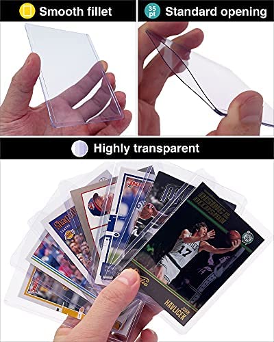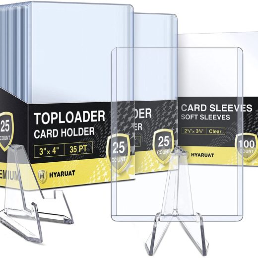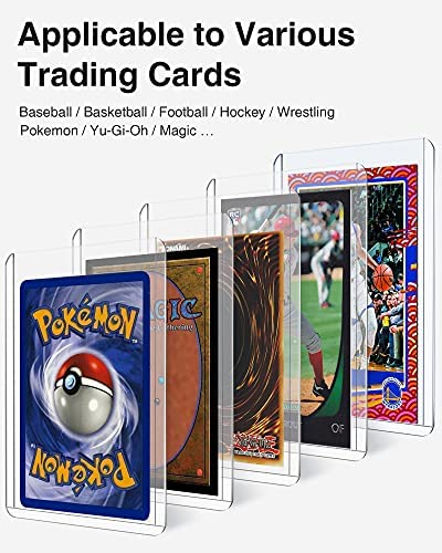 Double Protection: Simply place your card in the penny sleeve and drop into the toploader, achieve acid-free inner layer protection with rigid structural integrity in the outer layer; Protect the card from bending, scratches, tearing, fade, dust, damp ect. Hard Toploaders: Rigid PVC plastic and ultra clear, keep your cards safe for storage, display, during trade and in shipments. Exterior Dimensions: 3 x 4; Interior Dimensions: 2 5/6 x 3 7/8 (70mm x 98mm); 35 points in thickness. Soft Card Sleeves: Clear, acid-free, archival-safe, non-PVC, resistant to abrasion and scratches, protect sports cards and TCG cards from fading and stain. Exterior Dimensions: 2 3/5 x 3 3/5 (66mm x 91mm), fits inside topload card holder. Designed for Trading Card: Perfect for storage and display football cards, basketball cards, baseball cards, hockey cards, or other trading cards like Pokemon cards,YuGiOh cards, Magic the Gathering, Gloomhaven, ect. What You Get: 50 toploaders + 100 penny sleeves + 2 trading card stand, 1 sturdy packaging to keep them in good shape and transport them safely; Friendly customer service, just reach us for any after-sales service.