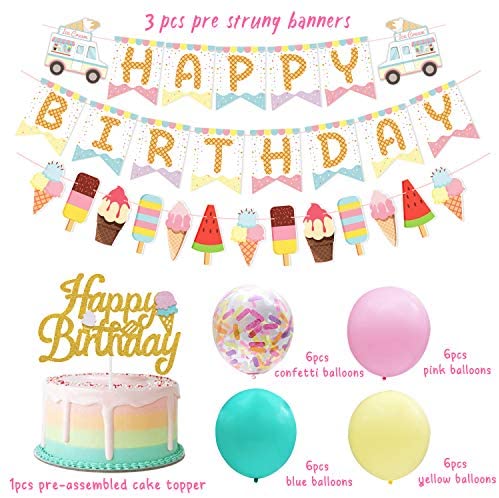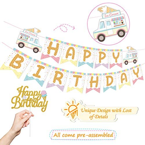 Ice Cream Birthday Banner and Cake Topper Summer Colorful Ice Cream Themed Kids Birthday Party Supplies