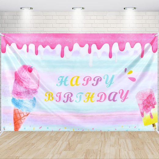 Ice Cream Happy Birthday Backdrop – 73 x 43 Ice Cream Party Decoration for Kids Girls B-Day Ice Cream Themed Party Supplies Photography Background Wall Banner