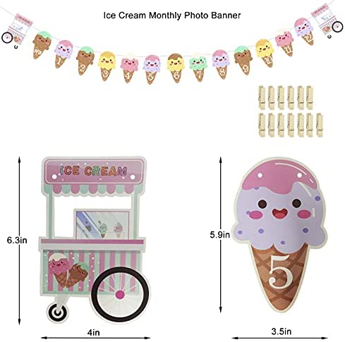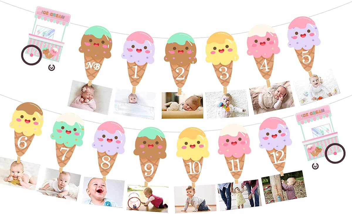 Ice Cream Monthly Photo Banner – Ice Cream 1st Birthday Monthly Banner Baby Girl 12 Month Photo Display Milestone Photograph Bunting Garland for Ice Cream First Birthday Party,Sweet One Summer Party