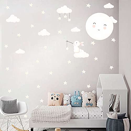 IKEYU Moon Star Wall Decals Cartoon Rabbit Wall Stickers Cute Bunny Moon Stars Clouds Wall Decal for Girls Bedroom Kids Room Nursery Decor