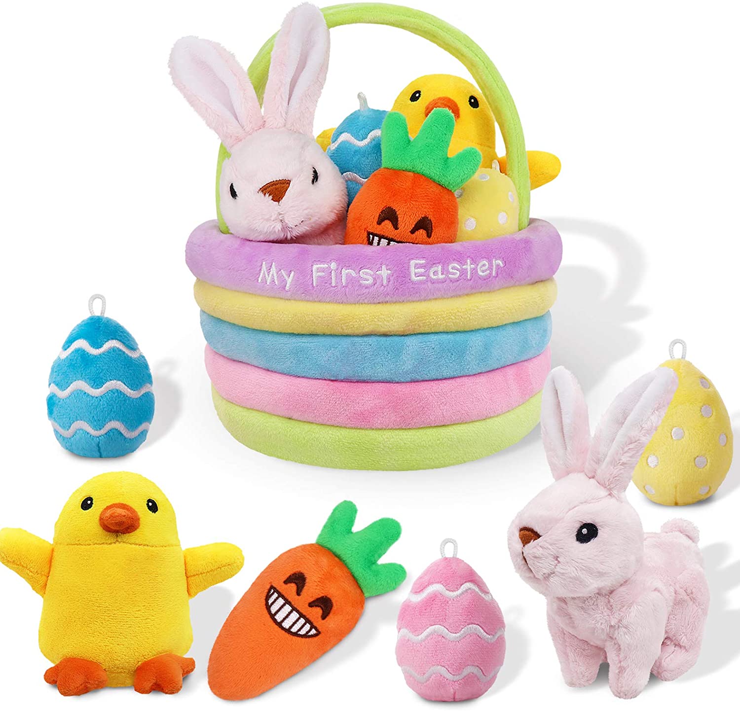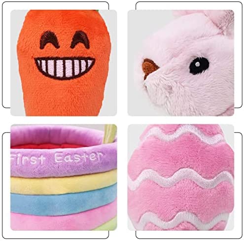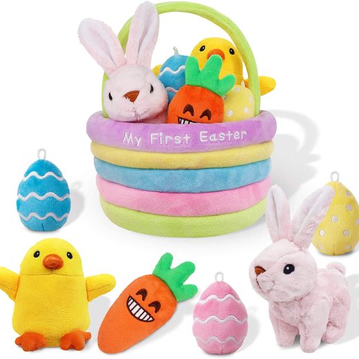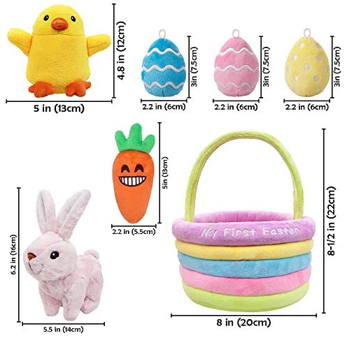 SUPER VALUE SET: The playset includes a stuffed bunny toy, three Easter egg toys, a carrot toy, a chick toy and a soft plush basket embroidered with My First Easter. All toys can make different sounds. Pinch carrot, it will crinkle. Pinch bunny & chick, it will squeak. Shake Easter egg, it will rattle. Great toys to catch the babys attention. SAFE FOR BABY: Ages 0+. Crafted with safe material. Includes no sharp objects or anything to swallow. SOFT AND CUDDLY: The small Easter basket and favors are all plush stuffed toys for girls and boys, makes a perfect gift basket for babys first Easter. This baby Easter basket can also be used as an egg hunting basket for kids. Support in handle makes it easy to carry everywhere. This Easter gift basket is also good for holding Easter eggs, stuffed toys, candies, chocolates and other small Easter basket fillers.