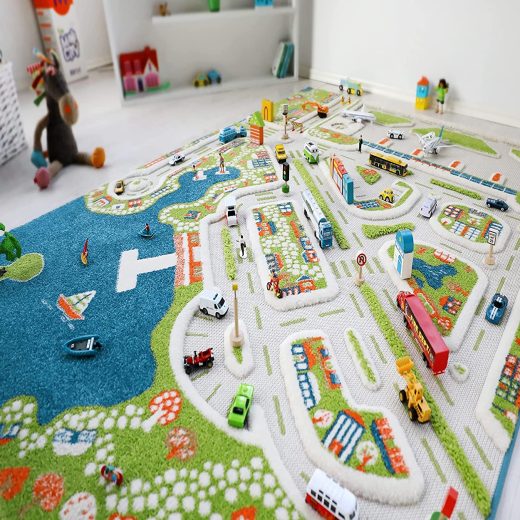 DESIGNED BY ARCHITECTS | Interactive kids car play rug with room for friends to join! EXCELLENT QUALITY | Hypo-allergenic, anti-static, stain resistant, made using non-toxic dyes and fabric. Easy to clean! AWAY FROM SCREEN | Simply add your childs favorite figures, toys, cars, dolls, houses or stuffed animals for a complete play set. No batteries required! 71 L x 53 W | Watch your children rediscover their creativity and imagination on their new and unique play rug. Furthermore, enjoy a family activity! (NB: Toys not included). Recommended Age 3+ Prop 65 compliant