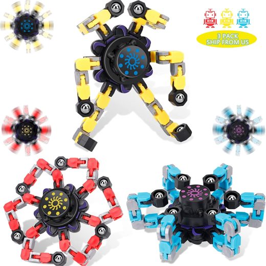 Transformable Fingertip Spinner- These latest Transformable Fingertip Spinners have various shapes. It can be changed into a spinner or a robot, etc. The chain of the spinners has no fixed shape, it can be twisted and deformed at will according to the shape you like. Three transformable fingertip gyros of different colors can be stacked together to get more visual impact, which is deeply loved by gyros enthusiasts. Safe and High-quality Material- 3 Pack Transformable Fingertip Gyro for kids are made of high-quality ABS plastic, and pressed at high temperature with excellent craftsmanship, tear resistance and durable deformation. Round Corner and Smooth Surface Fidget Spinners can protect your fingers from scratching. So you dont worry about your childrens safety. Fun & Smooth Spinning Toys- Transformable Finger Spinners has a steady axis to ensure that it does not shake at extreme speed. Excellent centrifugal design increases centripetal force and rotation time. Just hold the Sensory Fidget Toys Spinners with one hand or rotate it on the table. With a slight turn, the fingertip spinner can spin for a few minutes, bringing you endless entertainment. Effective Stress Relief Spinner Toy- With a Fingertip Gyro Cube Fidget Toy, youll be able to curb kids bad habits like nail biting. You can simply grab a fidget spinner and play instead of fidgeting back and forth with your nails. Many people have successfully curbed bad habits with this fun and cool fingertip toy. It can also exercise childrens ability to think and do things, improve hand-eye coordination ability, easy to play, compact size, easy to carry. Perfect Christmas Finger Toy Gift- 3 Pack fidget spinners toys are very suitable as a novelty perfect gift for kids, family, and friends. Just a little turn, the clear sound can reduce your anxiety. This unique and practical Sensory Fidget Toys gift is very suitable for office workers with autistic children and anxiety disorders. It is also suitable for school classroom rewards, gift bags, socks and gifts for Halloween, Christmas, and Birthday.