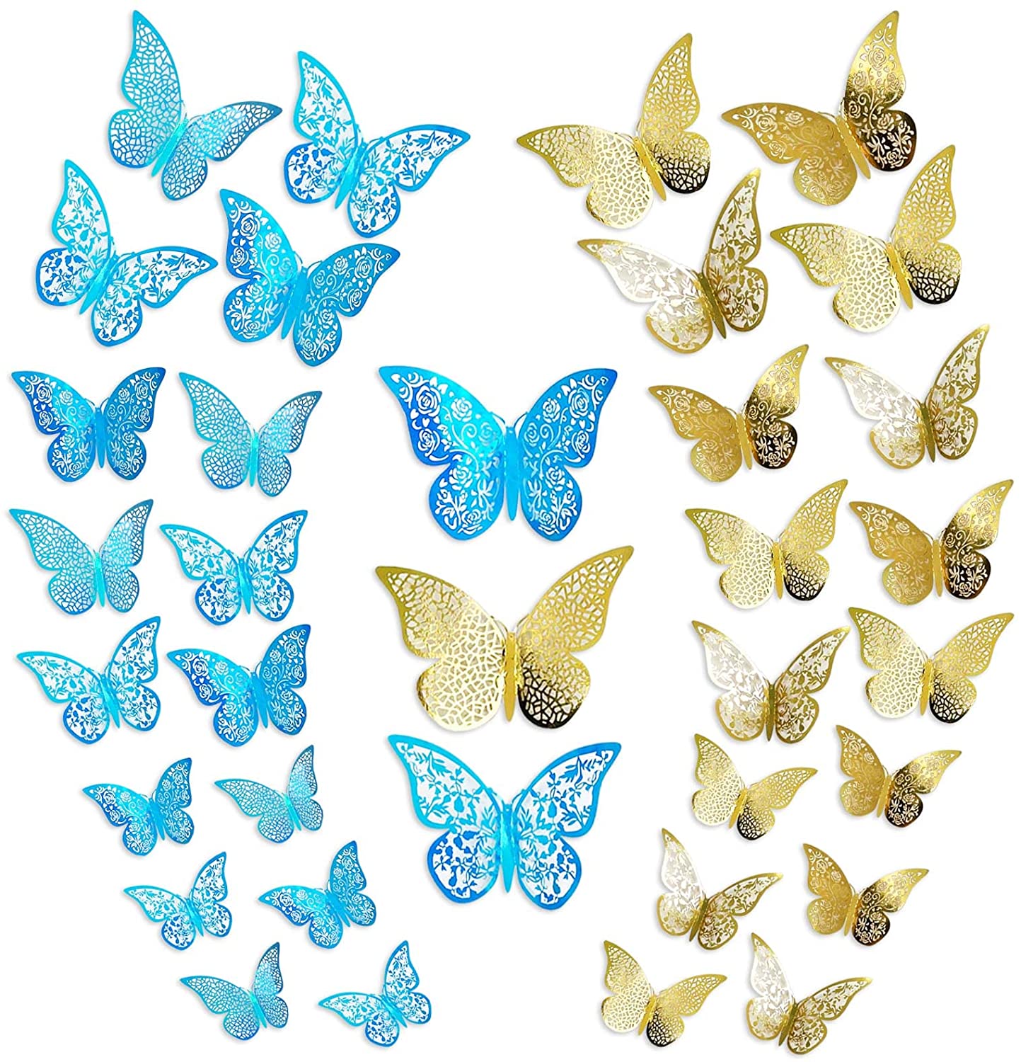 Package Included72pcs 3D Butterfly Stickers: 72 pcs for 2 colors(gold+blue) * 3 styles * 3 sizes(width:3/4/5).Each size has 4pcs,coming with 84 pcs double sided adhesive dots. 3D Metal Butterfly StickerButterfly wall stickers for living room are made of high quality hollow-out metallic paper with durable 3D shapes that do not fade easily. And the metallic feeling will make gradient color change in the light. Add a unique design to the monotonous living room, you can shape it on your own creativity to suit the living room walls. Cake Décor & Wedding Party DécorThe butterfly decorations for birthday,it can be used as cupcake picks, appetizer picks, fruit picks or party food picks, butterfly wedding decoration. You can DIY your design freely by your mind. Butterfly Décor for Girls Bedroomremovable Butterfly wall decals are one of the best choices to decorate a girls room, butterflies represent elegance and romance and beauty, hope these beauties take you into sweet dreams everyday. Wide ApplicationsPerfect for decorating any parties.such as wedding,birthday,bachelorette,engagement,new year eves,bridal shower,tea party,anniversary,graduation party,butterfly decorations for baby shower,hen party,rustic party,teal party,aqua party, theme party decorations supplies.
