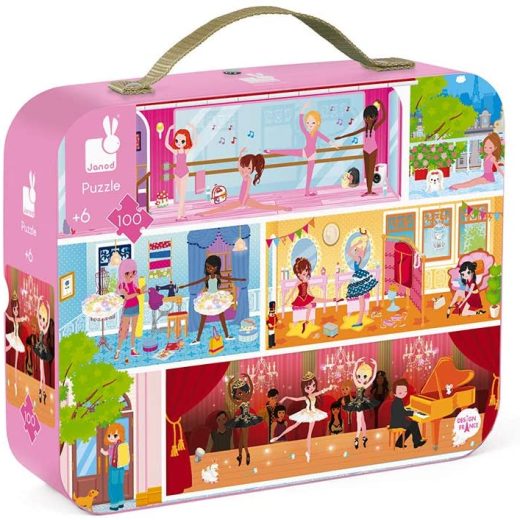 Janod 100 Piece Dance Academy Ballerina Floor Puzzle Toy u2013 Mini Suitcase Styled Hat Box for Organized Storage u2013 Store Everything Inside & Transport Everywhere u2013 Cognitive Development u2013 Ages 5 +