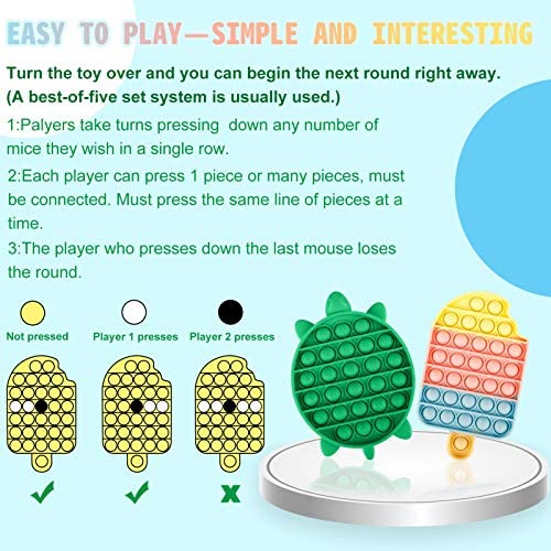 [NEWEST DESIGN—ATTRACTIVE AND PROFESSIONAL] We hire children experts and medical experts to design patterns. These patterns are Novel, Cute, Warm, and Moderate in size. It is very suitable to relieve stress, relieve anxiety, improve concentration, and develop intelligence. It is more Attractive and Professional than other products on the market. [UPGRADED MATERIAL—SAFER AND HEALTHIER] QUALITY IS OUR GOLDEN RULE! We use PREMIUM material. The push pop bubble stress reliever toys made of Environmentally Soft Material, Safe and Nontoxic, No Irritating Smell, Durable and Washable. Its also Water-Resistant, so you can play with it anywhere, even during bath time! Designed for REPEATED USE. Portable Size, Easy to Carry. You can Play WHENEVER AND WHEREEVER. [SUPER MULTIFUNCTIONA—STRESS RELIEVE AND INTELLIGENCE TRAINING] Our toys help alleviate stress and anxiety in children and adults, at work or life. Just press the mouse bubbles down and they make a slight popping sound; then flip it over and start again! You can Simply find the Happiness of Childhood! The toy also Improve Kids’ Logical Thinking. Good for intelligence development! [HIGH-TECH SENSORY BUBBLES—COMFORTABLE AND SOFT] Our push pop bubble fidget sensory toy is also a training tool for Fingers, Especially for workers who often use fingertips. It helps them Exercise the Flexibility and Sensitivity of their fingers. The bubbles are Soft and Comfortable, Do Not hurt your fingertips, and have Rebound. [EASY TO PLAY—SIMPLE AND INTERESTING] It is an Exquisite Mini Racing Game. Players take turns pressing down any number of mice they wish in a single row. The player who presses down the last mouse loses. Games rules are simple enough for a 5-year-old but coming up with a winning strategy fires up anyones neurons. Tips: There are many related gameplay videos on the Internet. IDEAL GIFT FOR FAMILIES AND FRIENDS. Buy Now to Enjoy Happy Time!