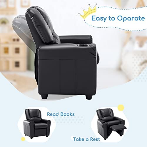 JC HOME Contemporary Leather Kids Recliner with Cup Holder and Headrest, Dark Black