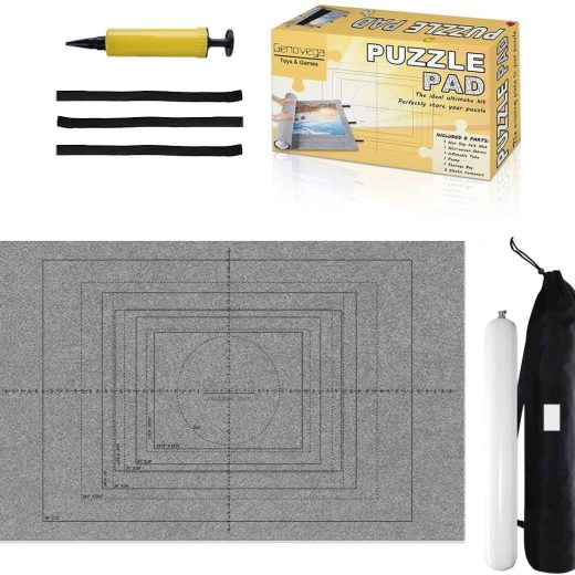 The Ideal Ultimate Kit Compared to other products, our puzzle roll up mat has got all accessories included: 1x Non Slip Felt Mat, 1 x Inflatable Tube, 1 x Hand Pump, 1 x Storage Bag, 3 x Adjustable Velcro Straps, Our kit has all the characteristics youve dreamed about !! Premium Fabric & Fine WorkmanshipThe frame lines on the puzzle mat can effectively help jigsaw players improve the efficiency of jigsaw puzzles and make it easier, We want to provide you unique products with high quality fabric and fantastic design. Easy To Use ItOur puzzle saver mat kit is optimized for easy use and convenience. Thats why it is designed to be packed in a single minute with 4 steps: first inflate the tube – then roll up the puzzle mat – after that tie up three bands – finally put it into the bag. Thats it! Pretty easy right! Easy Storing & Transporting Ideal jigsaw tool. Just roll up the pieces of the puzzle. You can store it and put the puzzle mat anywhere at home, on the ground, under the sofa, utility room, etc., or you can take it out, on the lawn, any place you like Hold Up To 3000 Pieces Of Puzzles We puzzle mat can hold up to 3000 pieces of puzzles, which are perfect for your requirements. Elders, youth or children, a Puzzle Enthusiasts or starter, you deserve our useful convenient puzzle mat kit. We provide you with an organized life and help you enjoy endless pleasure without worrying about storing your puzzle.
