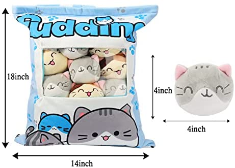 Adorable Pillow with 8 Little Cat DollsThere are 8 small stuffed cat plush dolls in each cute throw pillow. A bag of soft stuffed toys, so cute! Open the zipper, you will not only get a cute throw pillow, also you can get 8 lovely cat dolls. They are eye-catching for your kids and you can take them out as home decorations which will make your room more lively and cosy. Smooth FabricMade of high quality skin-friendly plush fabric, super fine and smooth, elastic, offers maximum comfort. Excellent workmanship, well sewing process and delicate craft. PP Cotton & Super SoftWith fulfilling high grade PP cotton lining, shaped and will not be deformed, comfortable hand feeling, very soft and fluffy, warm and comfortable for hugging. Multipurpose PillowThe size is 14 x 18inch (35 x 45cm), can be the best lumbar pillow or back cushion when you sitting on sofa, great for reading, playing, learning and watching TV, and also the most comfortable sleeping pillow for a sweet sleep on bed. Suitable to decorate home, bedroom, party, office, coffee shop and so on. Perfect GiftWith its cute appearance, the pillow can be accompany you or your friends through lonely time, is a surprise gift for your kids, lovers or friends. It is the perfect gift choice for Christmas, Valentines Day, or holiday decor, to give you a warm companionship. Did this as an Easter gift. Had the small dolls in separate eggs and used the bag to collect them. So much fun and happiness.