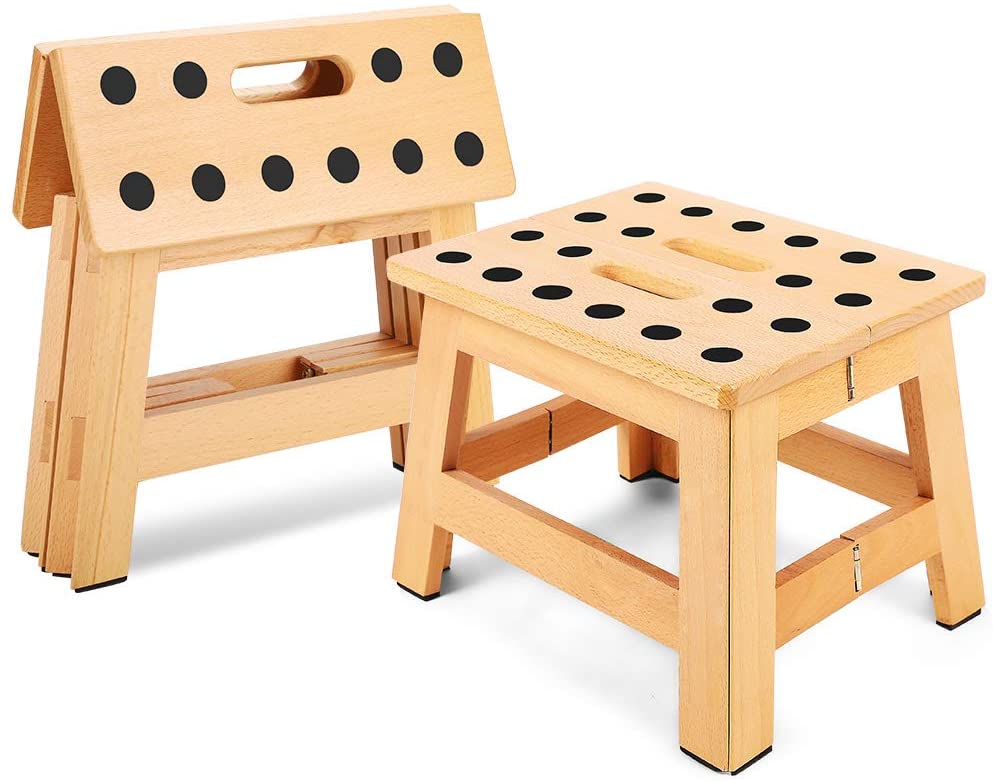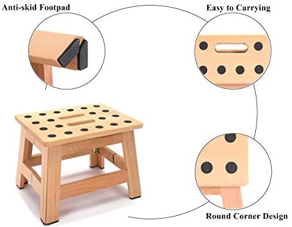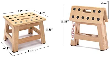Our super strong sturdy folding step stool are made of beech wood with a useful carrying handle at the top .Well worth the foldable step stool for being more robust and environmentally friendly. Product size:L11xW8.66xH8.85 inches;Nice wooden stool and supports a big weight load;the step stool extra strong and safe and can effortlessly hold up to 300 Lbs. Sturdy folding wooden stool with Grips carrying handle on top and anti-slip feet ,great for kids & seniors ;This is easy for a short senior or kids citizen to use, indeed easily snaps open and shut. Folds flat for easy space-saving storage so you just fold it nicely and put it in a corner or a cupboard. Very easily for compact storage. you can using the Folding step stool at anyplace such as Kitchen, Garden, camping, office, fishing and so on . the non-skid pads on the feet and non-slip dots on the stool surface. This was ideal to use on your wooden kitchen floor. the rubber feet on the bottom dont scratch your floor. It is sturdy and doesnt slide anywhere.the wooden step stool got rubber spots preventing slips and also looks great as it is wooden. This product has a product patent, patent number: 008521025-0001; 6133756.