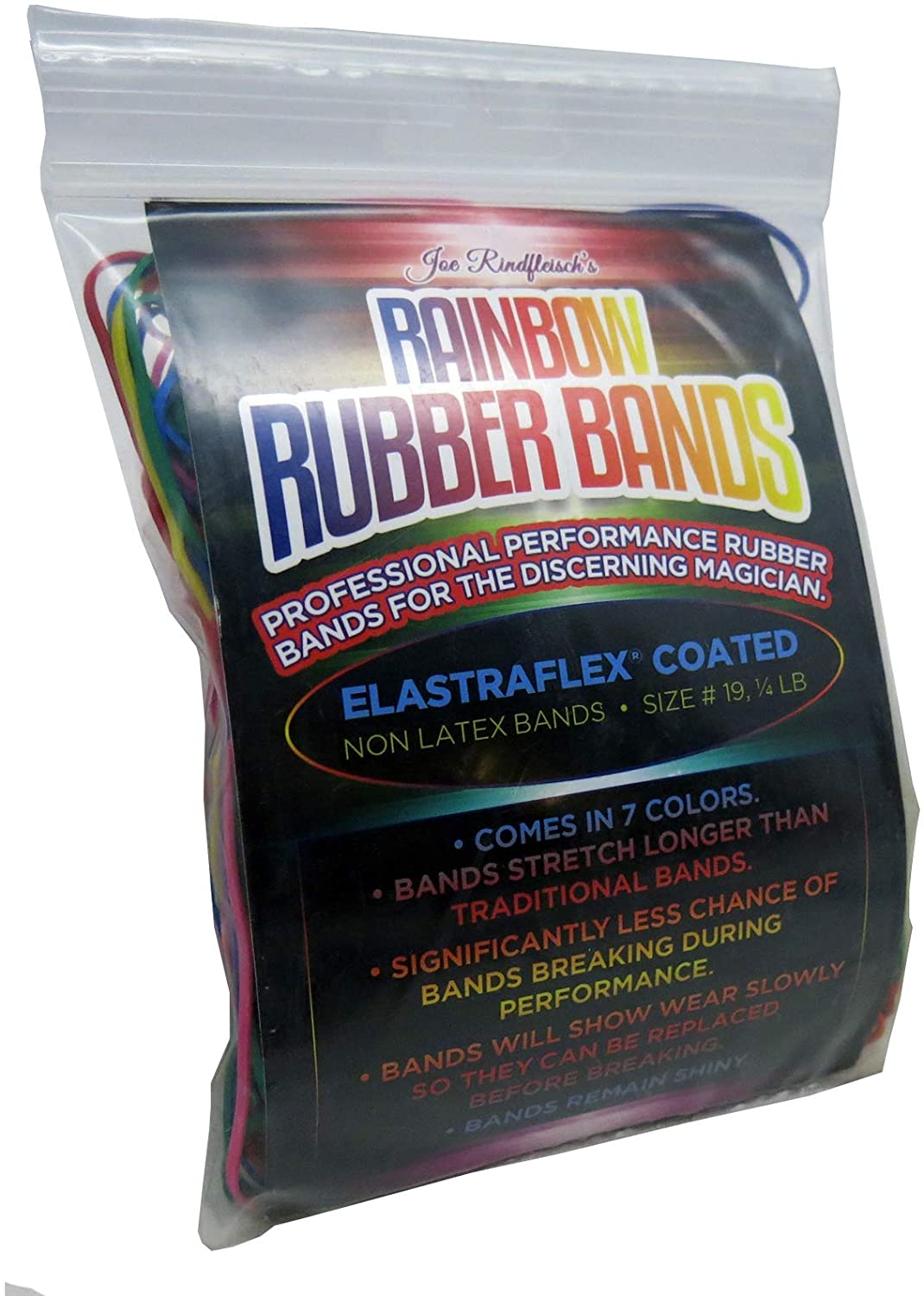 The Rainbow Pack is the perfect choice with all seven colors included in each bag. Each band is coated with Elastraflex which makes the bands stronger and less likely to break during performance. Bands are able to stretch further than normal bands and continue to stay shiny. These bands are smooth to the touch and dont feel like rubber as they slide smoothly against each other. Simply put…… if you do rubber band magic, you need these bands! Elastraflex Coated, Non Latex Bands Size # 19, ¼ LB Benefits Include:Comes in 7 brilliant colors. Hanson Chien Blue Marcus Eddie Green Daniel Garcia Orange Dan Harlan Deep Purple Russell Leeds Yellow Vincent Mendoza Pink Joe Rindfleisch RedBands stretch longer than traditional bands.Significantly less chance of bands breaking during performance.Bands will show wear slowly so they can be replaced before breaking.Bands remain shiny.Heres what top pros are saying:I love these rubber bands! They stretch better than anything Ive ever used, and the colors are so vibrant. Finally, rubber band magic can be sexy! – Dan HarlanJoes Rainbow Pack is by far the best choice around. With great elasticity and bright colors, they have become the weapon that I never leave home without. – Hanson ChienRindfleischs Rainbow Rubber Bands are Ridiculous! The added stretch makes certain moves effortless and the colors turn your magic HiDef. – Vincent MendozaThese bands are so stretchy and easy to use, it could take your performance to the next level. – Russell