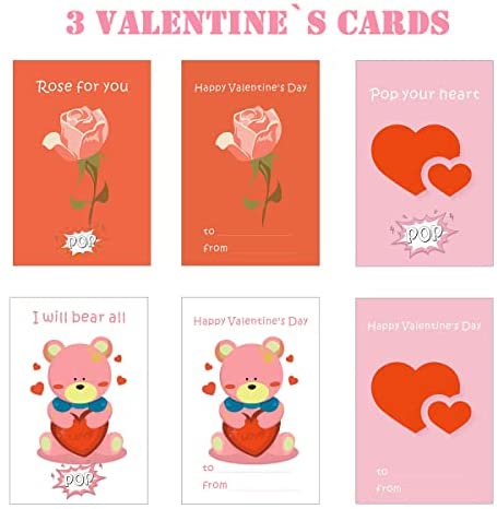 JoFAN 3 Pack Valentines Pop Fidget Toys with Cards Features: 1. The 3 pack Valentines Pop Fidget Toys are perfect for kids, boys, girls, toddlers, valentines toys, valentines gifts, valentines party favors, valentines day cards gifts, school event prizes, class exchanging gifts 2. You will get 3 style pop toys, they are designed as hearts, rose, bear, all in Valentines theme, have a fun and happy Valentines Day 3. Also there are 3 exquisite Valentines Day Cards in the package, they are Rose for you, I will bear all, POP your heart – best Valentines Gifts with cards 4. Push fidget toys, the newest sensory fidget toys, press the bubble to hear the POP, stimulate your auditory senses for pleasure and release stress Specifications: Styles: hearts, rose, bear Size: As pic shows Materials: Silicone