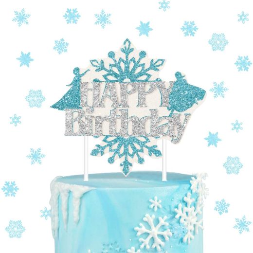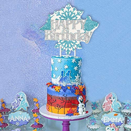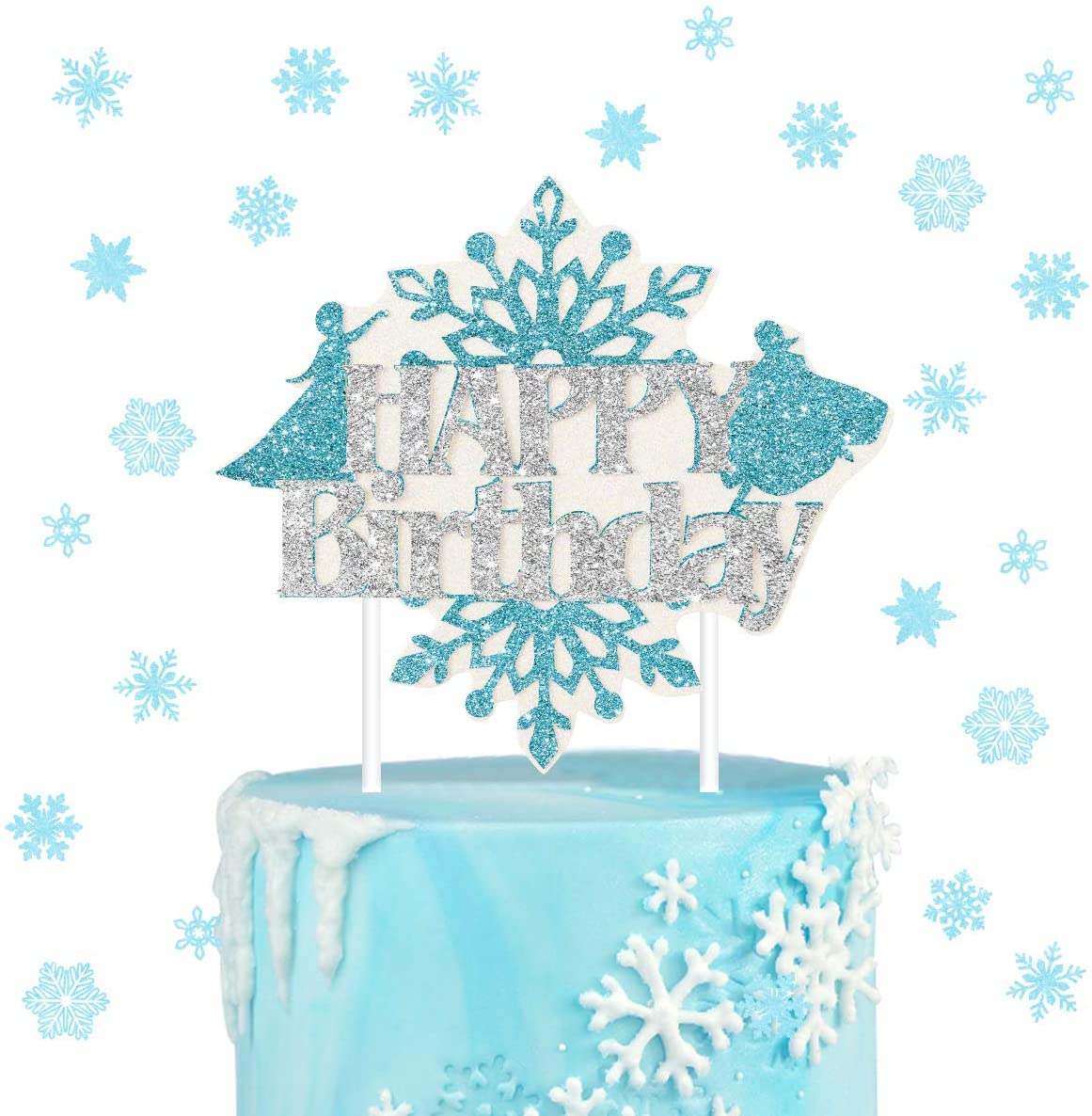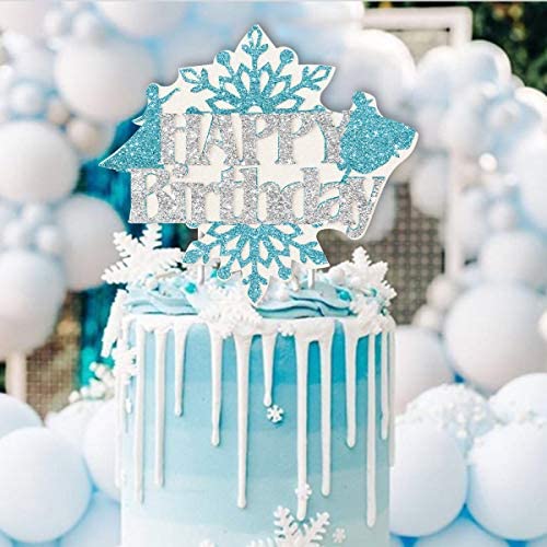 Frozen Happy Birthday Cake Topper Blue and Sliver snowflake Cake Topper for Winter Wonderland Birthday Party Decorations Supplies