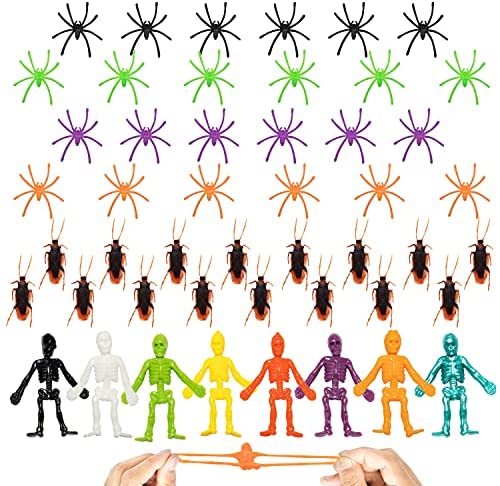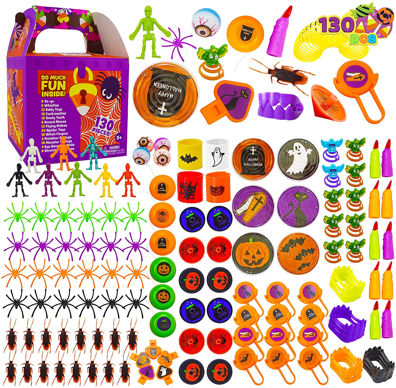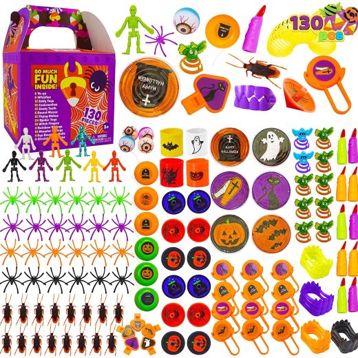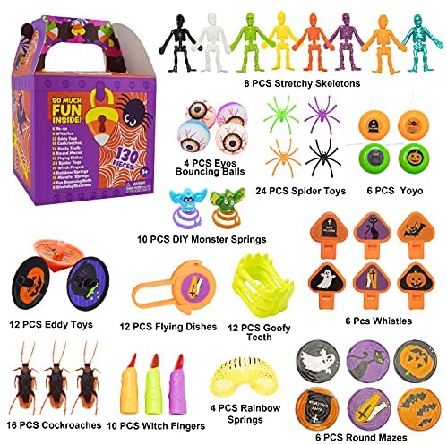 SUPER VALUE. Our 130 pcs halloween themed assorted toys set in a treasure box includes 13 different kinds of Halloween game toy gifts. Such as 4 pcs rainbow springs, 4 pcs eyes bouncing balls, 6 pcs round mazes, 6 pcs yoyo, 6 pcs whistles, 8 pcs stretchy skeletons, 10 pcs DIY monster springs, 10 pcs witch fingers, 12 pcs eddy toys, 12 pcs flying dishes, 12 pcs goofy white teeth, 16 pcs cockroaches, and 24 pcs spider toys. EASY TO USE. The treasure box has foldable handles and easy access for toys. Easy to carry around while securing the toys inside. IDEAL HALLOWEEN TOYS. This assorted halloween toy is perfect for treasure hunting games for kids. Would help them develop new life skills while having fun playing. Great also as a gift for birthdays, party game toys, party favors, halloween trick or treats, and more. SAFE FOR CHILDREN. Non-toxic, non-BPA. Meet US toy standards. Safety test approved. CUSTOMER SATISFACTION. Providing a great shopping experience is our main priority to our customers. Feel free to message us through “contact sellers” if products dont meet your expectations. The celebrations start at JOYIN!