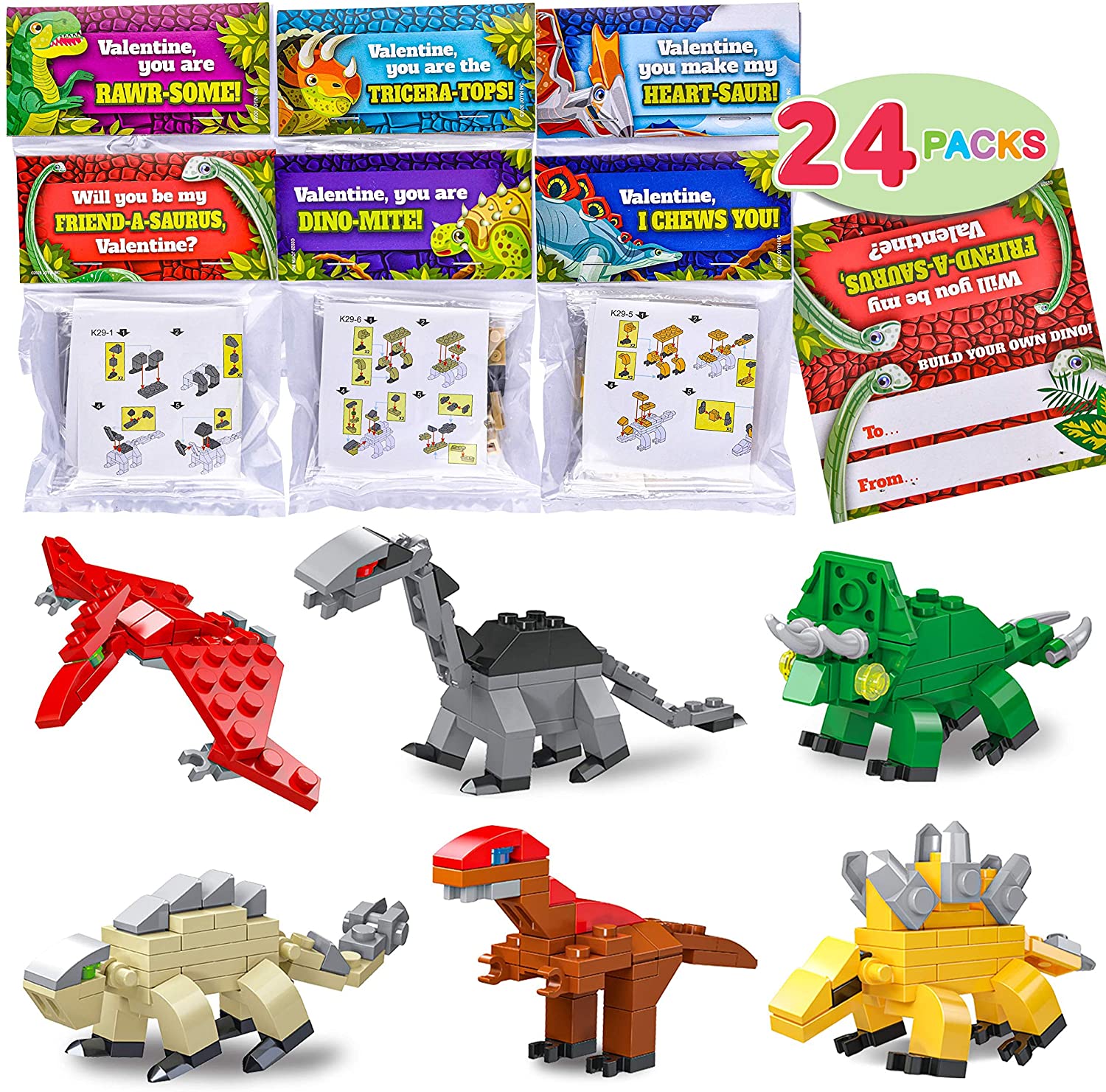 JOYIN 24 Packs Valentines Day Cards with Dinosaur Building Blocks for Valentine Party Favor, Classroom Exchange Prize, Valentineu2019s Greeting Cards