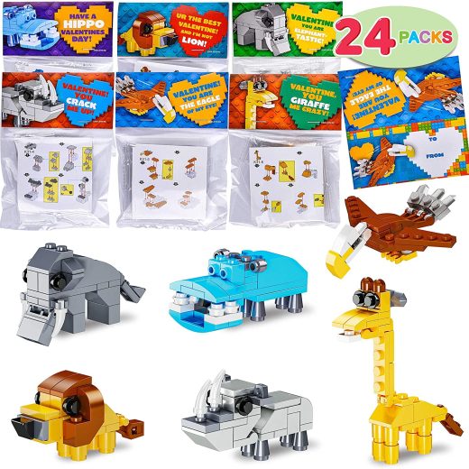 JOYIN 24 Packs Valentines Day Cards with Safari Animal Building Blocks for Valentine Party Favor, Classroom Exchange Prize, Valentineu2019s Greeting Cards