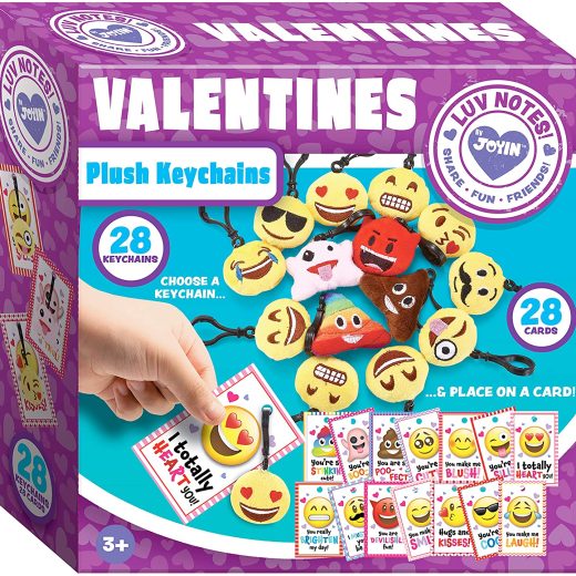 JOYIN 28 Pack Valentines Day Gifts Cards for kids, Valentines Greeting Cards with Emoji Plush Key-chain Valentine Classroom Exchange Gifts Party Favors