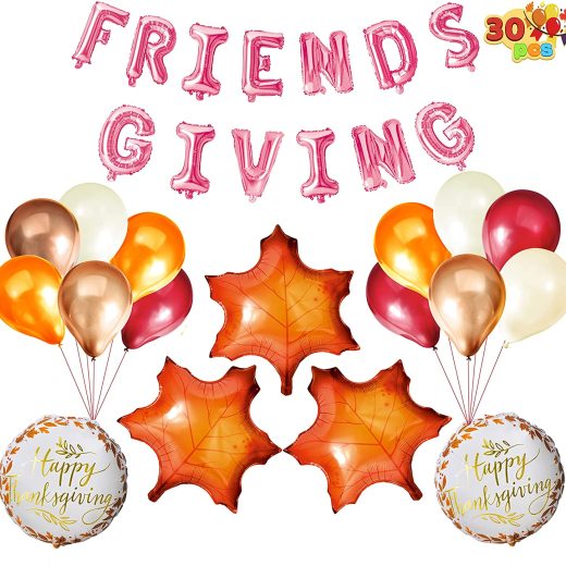 JOYIN 30 Pcs Thanksgiving Party Decoration Set Includes Pink FRIENDGIVING Foil Banner, 3 Large Maple Leaf Balloons, 2 Combo and 12 Latex Balloons Hanging Decoration Fall Holiday Decor Party Supplies