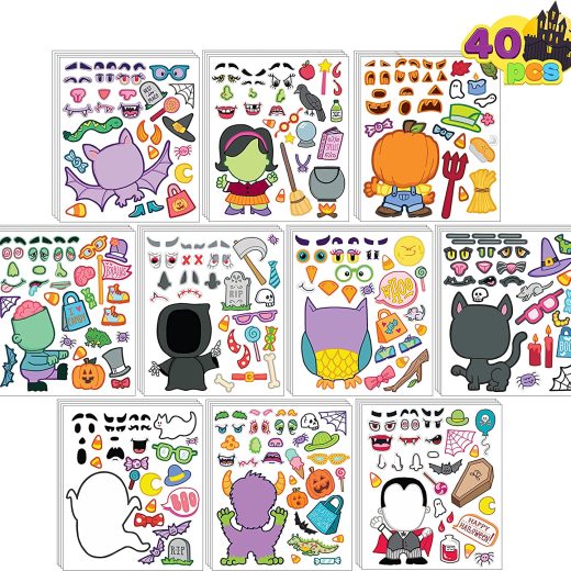 SUPER VALUE PACK. Our Halloween stickers set includes 40 pcs full-body make a face stickers with 10 designed Halloween characters. Pack includes Vampire, Witch, Ghost, Owl, Bat, Kitty, Reaper, Monster, Zombie and Pumpkin. UNIQUE DESIGN & EASY TO USE. Decorate your own Halloween monsters with these DIY craft stickers for kids. Children would enjoy decorating their favorite ghost, vampire or monster with their friends. Perfect for anyone to feely customize and create halloween characters. Also good for teamwork for kids to play together. ENDLESS FUN. Enjoy Creativity and Fun to Your Party Celebration for Halloween, Birthday and House Party, Group Activity, Art Class or other Activities. PREMIUM QUALITY. Child Safe: Non-Toxic. Meet US toy standards. Safety test approved. CUSTOMER SATISFACTION. Providing a 100% satisfaction experience is our main priority to our customers. Feel free to message us through “contact sellers” if products don’t meet your expectations. The celebrations start at JOYIN!