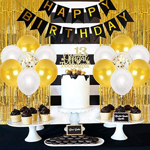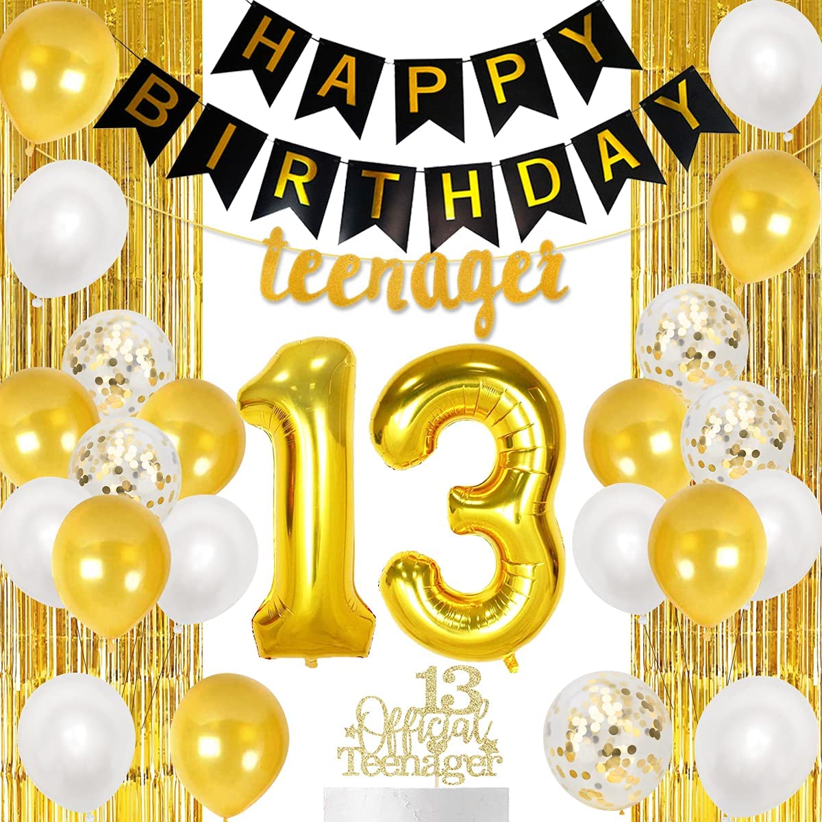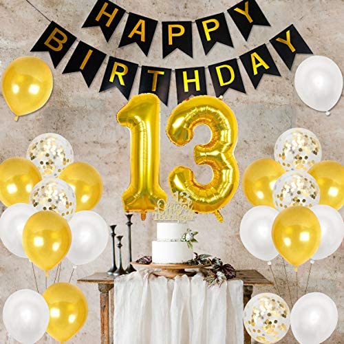 Latex You Will Get: 1 happy birthday banner, 1 set of number 13 foil balloon, 21 latex balloons 12 inches (8 gold, 8 white, 5 gold confetti), 1 cak…