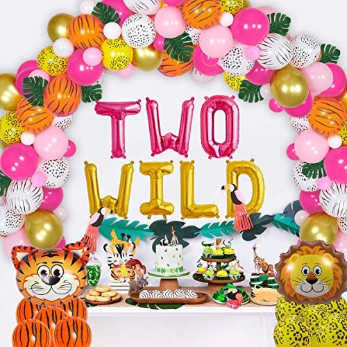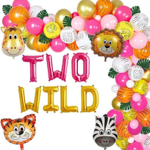 PACKAGE: Two Wild foil balloons banner, 80 Packs Balloons Garland Kit includes 5 animal head foil balloon, 20*12” matte latex balloons (pink and rose red), 20*12” animal strip/spotty balloons, 5*12” metallic gold balloons, 30*5” matte latex balloons and 12*6.8” artificial palm leaves, 1 balloon tape strip with 110 holes and 1 roll 100 double-sided glue dots. WIDE APPLICATION: Our decorations kit is perfect for girls jungle themed safari second birthday party, also suitable for Hawaii Luau Flamingo Aloha Pool Party, spring summer beach party, can be balloons arch or bouquet, floral arrangements, home and table decor, photo shoot, party games etc. This garland can be assembled and placed indoors or outdoors. UNIQUE BANNER: The banner Two(rose red)Wild (gold) balloon is 16 inch, will be a highlight, catching everyone’s attention. Foil balloon is self-sealing, non-toxic, reusable and more durable, easy to inflate with a pump, air/helium supported. Animal balloon can float with helium but banner cannot, you can inflate with air and hang them on the wall, dessert table, in the backyard or as a backdrop. BALLOON ARCH GARLAND KIT: Multiple color (pink, rose red, yellow, orange, white, metallic gold) and size (12” and 5”) . Try to blow up the balloon as round as possible and match balloons with different sizes and colors to make balloon garland arch appears more gorgeous, creating a vibrant Jungle world. EASY TO ASSEMBLE: Balloon tape strip is made of plastic material with 110 holes to hold inflated balloons in place. Balloon glue are double-sided adhesive dot stickers, each roll with 100 pieces glue points, easy to use. Just inflate your balloons and tie knot, then put the balloon knot through strip holes to create your own balloon garland.