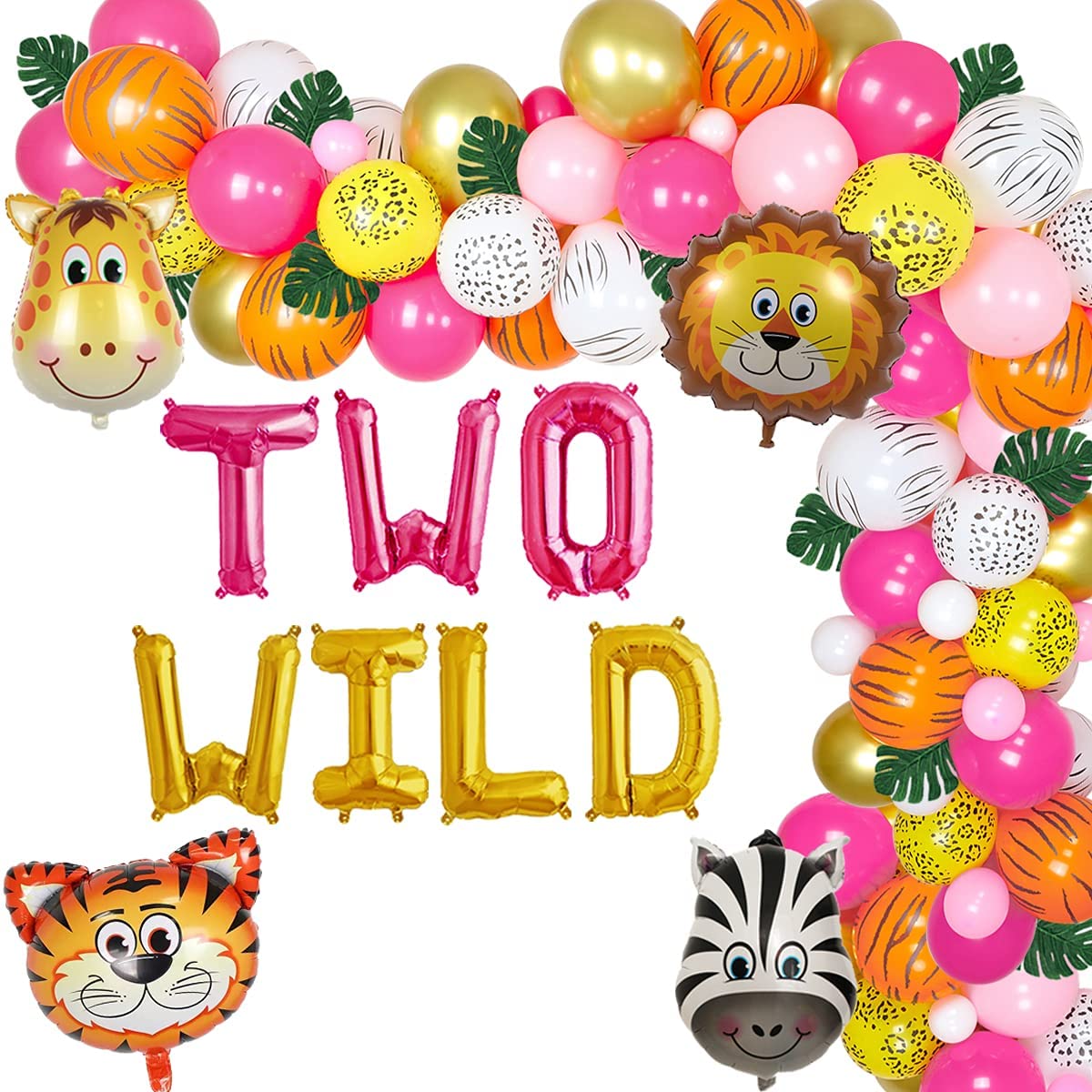 PACKAGE: Two Wild foil balloons banner, 80 Packs Balloons Garland Kit includes 5 animal head foil balloon, 20*12” matte latex balloons (pink and ro…