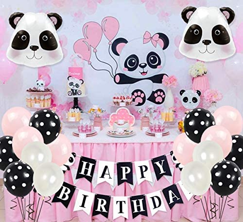 JOYMEMO Panda Birthday Party Supplies for Girls, Panda Head Foil Balloons Cake Toppers Pink Happy Birthday Banner for Baby Shower Birthday Decorations