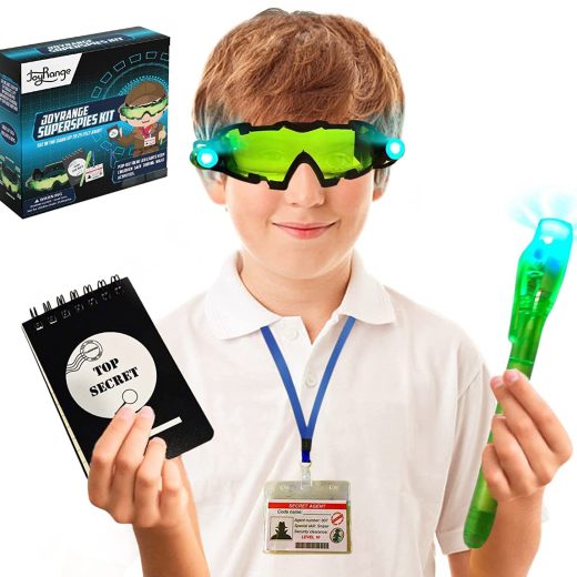 This Spy Kit includes 5 spy gadgets all kids dream for. One Spy Goggles powered with LED lights, an invisible ink pen with a top-secret 4X2.8 inch notepad for secret messages, and a Lanyard ID Spy Card Holder With Spy Id Card included The Spy Goggles are tinted green and provide night vision with 2 side pop-up LED lights that brighten up to 25 feet ahead in the dark, The Goggles have comfortable nose pads and adjustable elastic bands for the perfect fit for each child keeping children entertained, thinking, and using their brains. Makes great recreational and imaginary play keeping children entertained for hours on end. using the Spy Pen to write Top Secret in the Notepad will give kids a place to record their super-secret dont want stories, drawings, and more Thoughtful Gift Idea for Girls and Boys! Racking your brain trying to think of a gift that you know your child will not only love but will put to good use? This Spy Set is a “can’t miss” gift idea!