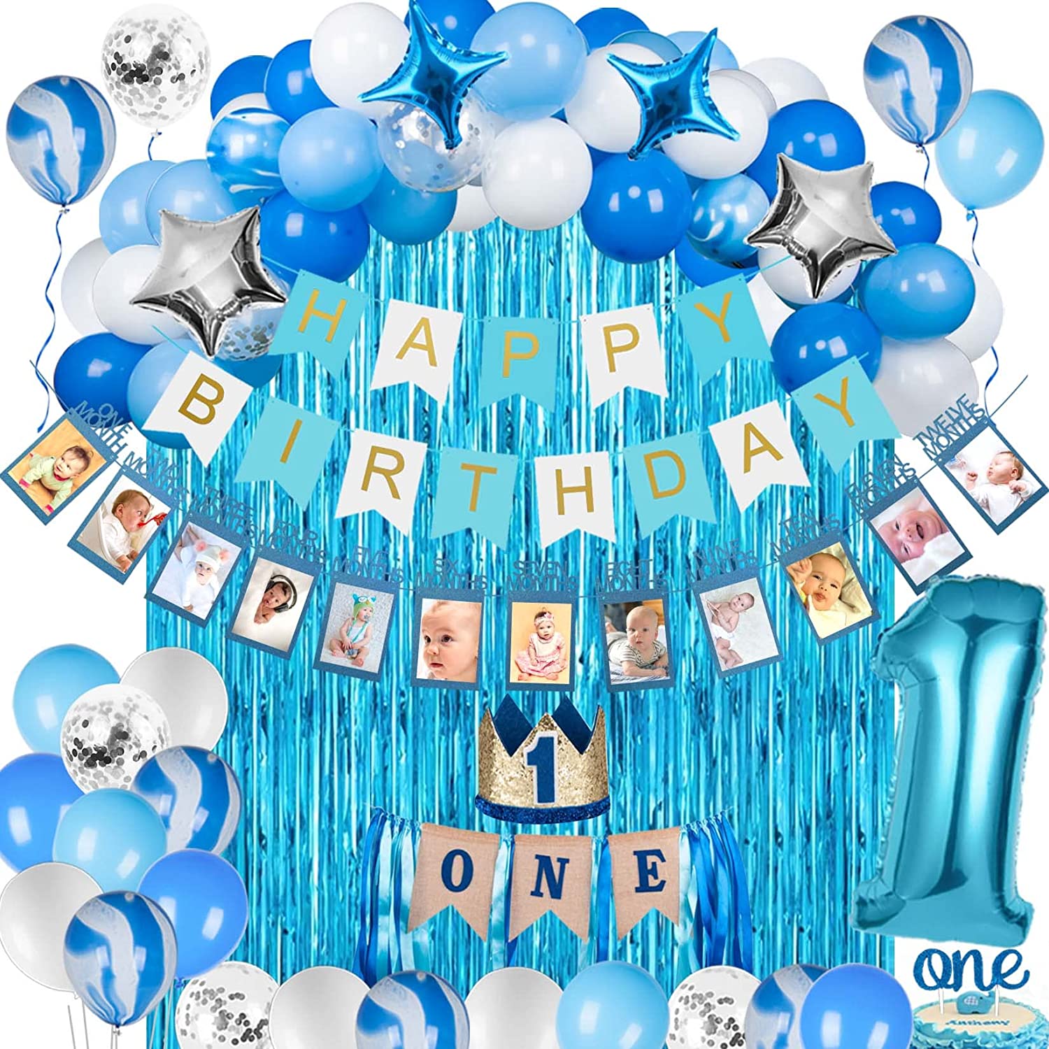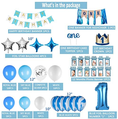 JOYYPOP 1st Birthday Boy Decorations 66PCS Blue 1st Birthday Decorations for Boy with 12 Months Photo Banner, 1st Birthday Baby Crown, ONE Cake Topper, 1st Birthday Highchair Banner