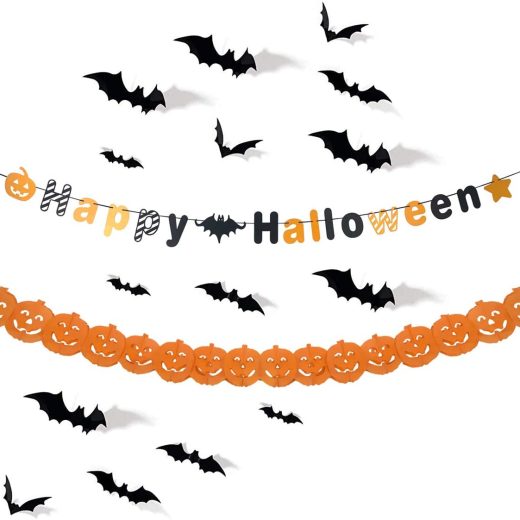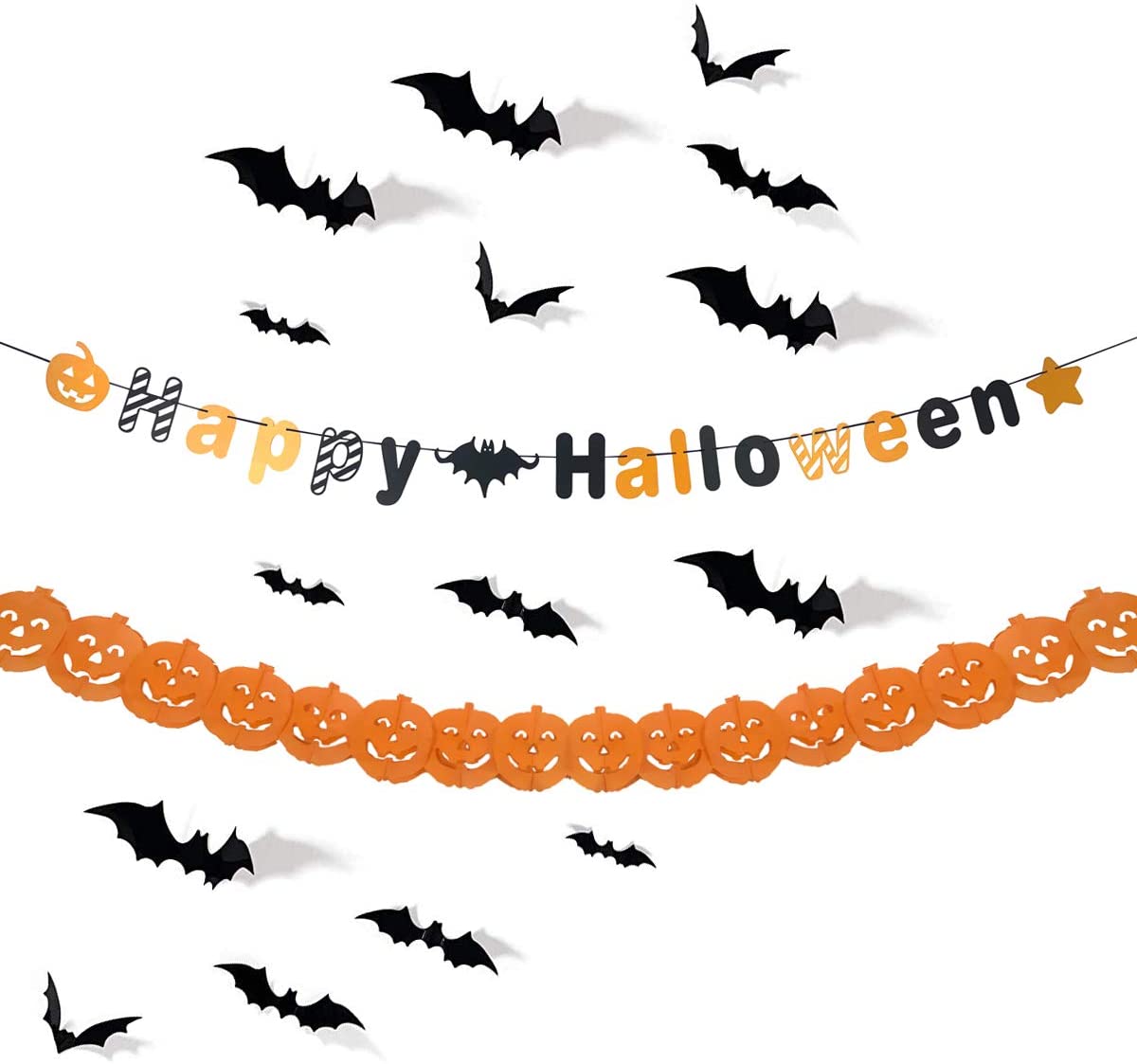 JRrutien Happy Halloween Banner Pumpkin Paper Garland 3D Bats Scary PVC Stickers Decal Wall Halloween Party Decorations