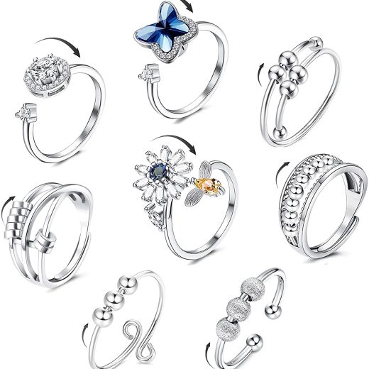 ANXIETY RING FOR WOMEN?The fidget rings set contains 8 anxiety rings for women, spin the ring when youre feeling anxious,the spinner vibrates on your finger in a really soothing way, it makes a super quiet whirring thats not intrusive. Fidget anxiety ring also help you get rid of picking your cuticles and biting your nails.Spinner ring is not only fashion accessory but fidget toy to stress relief ring. Perfect for anxiety reduce, stress relieving, focus or redirect bad habit. RELIABLE QUALITY?These stacking spinning ring for women is made of quality 316 stainless steel and AAA+ cubic zircon, open design can meet most of your sizes. Hypoallergenic and will not turn skin red or green. Cute ring has smooth and lasting luster, never worry these ring will scrape your finger up. The spinner bead ring design is full of fun. The zircon is tightly inlaid and will not fall off. FIDGET RINGS FOR ANXIETY?These fidget spinner ring have a rotatable design can quickly rotate 360 degrees.When you feel angry or stress out just spin these spinning ring. It can effectively help tremendously in diverting your negative habit.This fidget rings make no noise when they rotate, you can wear fidget spinner rings on your finger and be able to spin the top under the counter at work and under the desk at school without anyone noticing. Fidget Jewelry Gift?These fidget rings are all adjustable, the size can be adjustable between 4-10 suitable for most womens girls and teens. Packed in a black bag ready to be given as a gift.Such great fidget spinner rings can help quit the bad habit. They are Gorgeous and Sparkly Enough.You can share these stackable rings with your daughter,your classmate,your mother or your sister as Mothers Day Gifts,Christmas Gifts,Birthday Gifts.Perfect fidget jewelry for your all outfits. Still HesitatingJstyle service customer in over 6 years.We aim to provide best jewelry to our every customer.Our package are delivered by a professional team from a local warehouse,fast delivery within 1-5 days.If you have any questios with this peace ring.Please contact us.Jstyle will solve your problem within 24h.