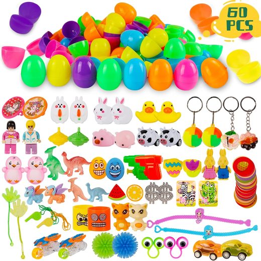 EASTER EGGS FILLED WITH TOYS: 60 pack Easter toys set with different small cute toys, novelties inside, suitable for a variety of unlimited play scenarios for children. Kids will be delighted to discover the surprise in each Easter egg they hunt! It is so exciting and great gift for all boys and girls. Please note that the item is NOT PREFILLED, please self-assemble your surprise. ADORABLE DESIGN: Each egg will filled with one toy and one sticker. This unique party favors set includes 30 types of toys like pullback cars, Easter theme rings, bouncing balls, mochi squishy, fruit erasers, building block toys, key chain, emoji toys, etc. Easter toys have thicker eggshells and in bright solid assorted colors. HIGH QUALITY & SAFE MATERIAL: All Easter basket stuffed toys are made of 100% non-toxic plastic, safe for all girls and boys, very delicate and vivid. The bold colors and lively faces of these toys can instantly attract attention at kids party! PLAYFUL LEARNING: Use these for egg hunting at Easter party, it will surely bring endless fun to your family. They are great to pretend to play props, enhancing vocabulary, language skills, creative thinking, and active cognitive learning through imaginative play. GREAT FOR EASTER: These Easter party favors are great for Easter egg hunts, community hunts, Easter theme decoration, party favor bags, Pinata fillers, school classroom rewards, holiday gifts, goodie bags, grab bags, and school prize box.
