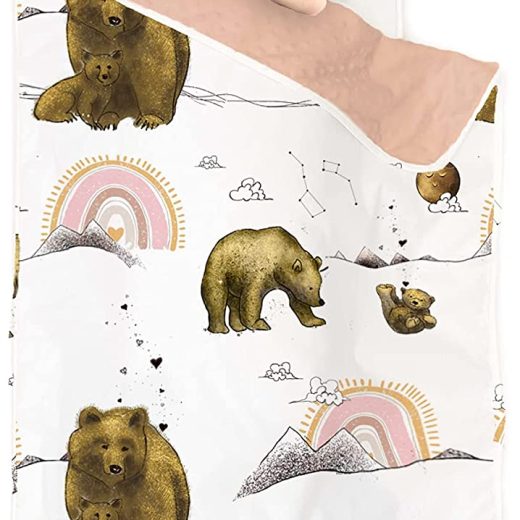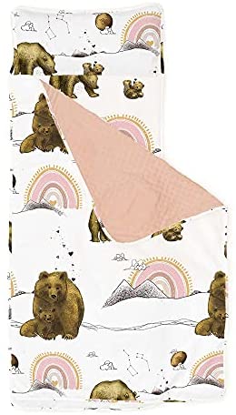 All In One Nap Mat with Adjustable Pillow Height – This longer 53” x 21” kids padded nap mat has a built-in name tag, easy close and carry, attached 30” wide blanket and adjustable pillow. Flip the pillow up or down depending on your child’s height! It’s everything you need for older toddlers at daycare, preschool, for travel or home. Travel Friendly – JumpOff Jo’s long nap mat for children can be rolled up and secured with hook & loop tape fasteners. There’s even a carry handle to make it that much easier to grab and go. Cozy & Comfortable – Designed with a longer padded base, soft minky-lined 45-inch-long blanket, and plush pillow, this toddler nap mat is so comfortable that you may be tempted to steal it for yourself. But you wouldn’t do that. Would you Easy To Clean – 100% Cotton outer with soft poly minky for the blanket lining. The pillow is removable, making it easy to wash this child’s nap mat. Original Design – Our sweet mama and bear cub snuggle together under a gorgeous rainbow and happy sunshine in this original nap mat design by JumpOff Jo. The colors of gold, grey and pink mix with black and white on the crib sheet to soothe the mind and inspire peaceful nap time dreams.