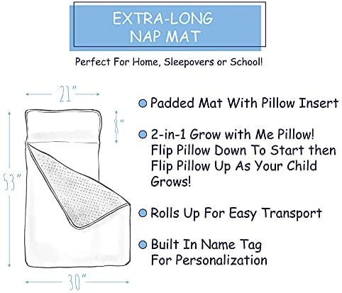 All In One Nap Mat with Adjustable Pillow Height – This longer 53” x 21” kids padded nap mat has a built-in name tag, easy close and carry, attache…