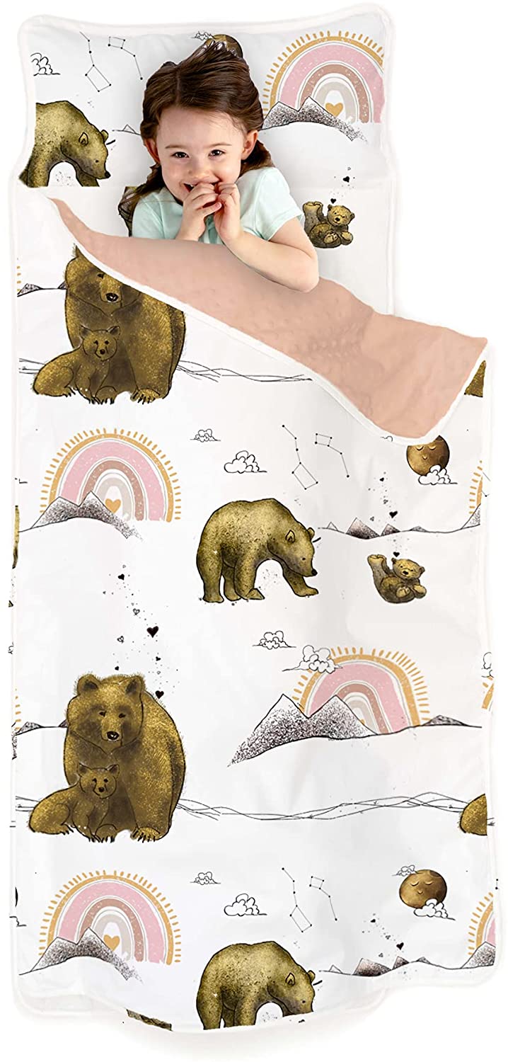 JumpOff Jo u2013 Extra Long Toddler Nap Mat u2013 Childrenu2019s Sleeping Bag with Removable Pillow for Preschool, Daycare, and Sleepovers u2013 53 x 21 Inches, Blanket 30u201d Wide u2013 Rainbow Bears
