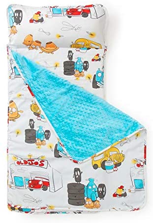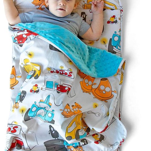 Original Design – Your boy or girl will love examining all the little details at Jo’s Garage on this fun cars and truck pattern. The unique whimsical design with a red vintage car, blue tow truck, yellow school bus, happy orange cones and auto shop tools at Jo’s Garage is an original design that’s sure to entertain your little mechanic. Nap Mat, Pillow, & Blanket – This 43” x 21” kids padded nap mat has a built-in name tag, soft dot minky blanket (33 high), and a pillow (10 high). It’s everything you need in a nap mat for daycare, preschool, or at home. Travel Friendly – JumpOff Jo’s nap mat for toddlers can be rolled up and secured with hook & loop tape fasteners. There’s even a carry handle to make it that much easier to take with you when you’re on the move. Cozy & Comfortable – Designed with a padded bottom, soft blanket, and plush pillow, this toddler nap mat is so comfortable that you may be tempted to steal it for yourself. But you wouldn’t do that. Would you Easy To Clean – The pillow is removable, making it easy to wash this child nap mat