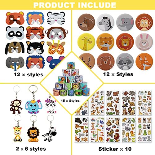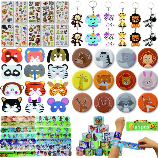 Children have a natural yearning for nature. When they see all kinds of animals, they are full of curiosity. In order to satisfy their curiosity and popularize their knowledge of nature, it is better to come to a jungle party We have a lot of party favors, Each one is loved by children Next, I will introduce our products to you We have a total of 61 PCS party decorations such as felt anima masks, keychains, temporary tattoos, button Pins, slap circles, etc., which can meet the needs of jungle parties We use high-quality materials, are absolutely safe and reliable, and can be reused so that your children can last a long time in this party atmosphere and enjoy the joy of the party The package includes: 15 PCS slap circles 12 PCS button Pins 10 PCS temporary tattoos 12 PCS felt anima masks 12 PCS keychains The perfect party favors will bring you an absolute experience and an unforgettable experience for your family and friends