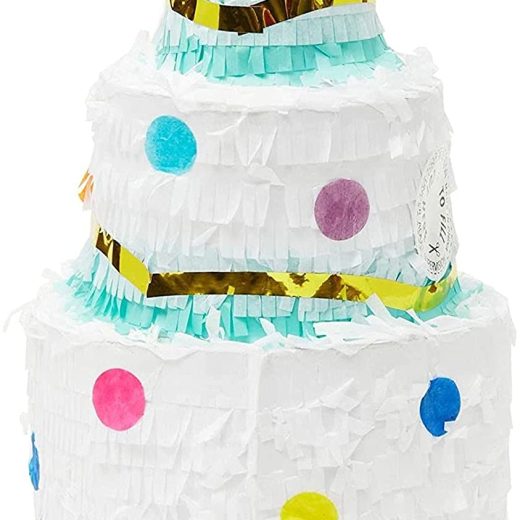 Small white 3 Layer birthday cake designed pinata with colorful dots, blue and gold foil trim. Ideal for birthday party celebrations and to complete your party decor. Medium size: 7.2 Diameter x 12.1H inches