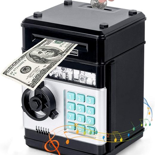 Two Saving Ways:There is a coin entrance at the top of the piggy bank,which can be used to put coins directly;in front of the piggy bank,there is a bill entrance.When you draw the bill close to the entrance,iit can be rolled into the machine automatically,which is very convenient. Password Protection:This piggy bank can be set with a password.Only by entering the password,the child can withdraw money,safe,no longer worry about your pocket money! The default password is0000,you can also modify the password yourself. Mini ATM safe bank:Kids safe bank adopts a exquisite design and cute appearance for children, ideal for boys and girls over 3 years old. Smart Voice Prompt:Enter the current password and open the door .Also if you enter the wrong password,the sound PLEASE TRY AGAIN will be issued to tell you. Safe Material and size:This piggy bank is made of high-quality ABS plastic,has no odor,is not easy to break,sturdy and durable. Size:8.34 x 5.9 x 5.9 in; Weight: 1.42 Pounds. Can store many Coins and paper money. Delicate Gift for Kids: This piggy bank can provide exquisite gifts for children,you can use it as a birthday gift,Thanksgiving gift,party gift,Easter gift and so on.Use it to help them develop a good habit of saving money.