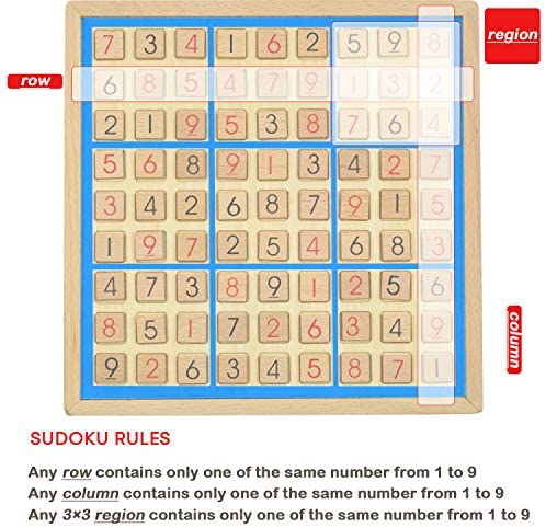 81 NUMBERS SUDOKU BOARD – 9×9 grid with 3×3 regions, the most popular size is suitable for most Sudoku lovers. DOUBLE-SIDED RED & BLACK NUMBERS – Each tile has a red digital and a black digital on its both sides. At the beginning of the game, black numbers are used as givens. Usually black numbers are also used for your definite answers, and red numbers are used for your possible answers. BUILT-IN DRAWER FOR EASY STORAGE – All tiles and the solutions booklet can be stored to the the built-in drawer neatly so that they can be easily accessed and not easily lost. Includes 99 small tiles: 81 numbers for Sudoku game, 18 spare digits. PREMIUM SAFETY MATERIALS – Made with high-quality wood and eco-friendly paint, safe and durable. WELL DESIGNED FOR GIFTS & COMPETITIONS – Great design and well made, its a good choice for the sudoku competitions and also it can be used as a wonderful gift.